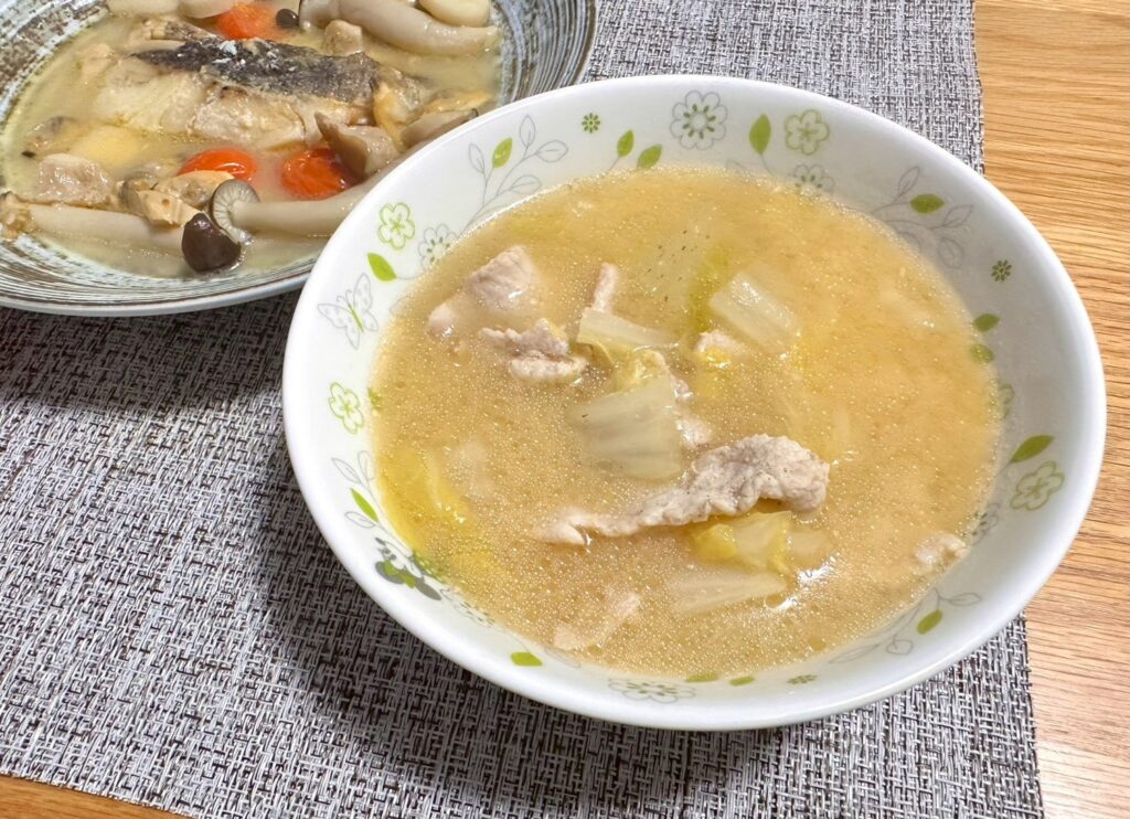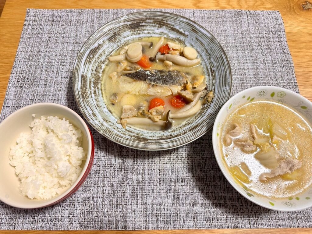 アクアパッツァをメインに、豚肉と白菜で味噌ベースのスープを作り、白ご飯を添えています。