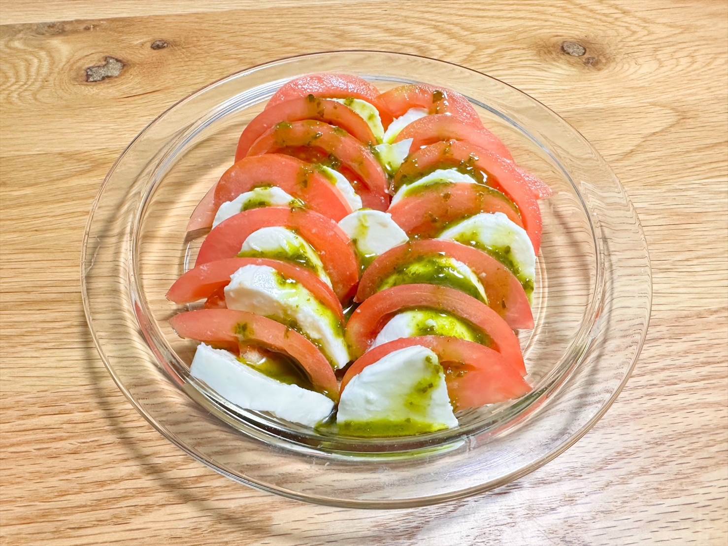今回はシンプルにバジルソースの味を試すべく、カプレーゼにかけてみることに。