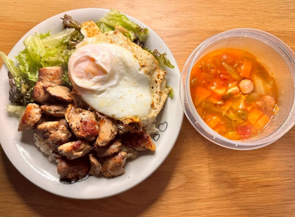 スーパーで売っていた味付きの鶏肉を焼いてもち麦ごはんの上にON。サニーレタスと目玉焼きを乗せてカフェ風の丼にしたものと、昨日の余りのミネストローネを用意しています。