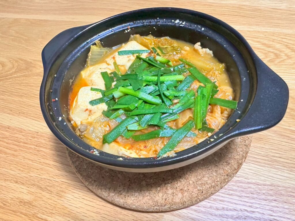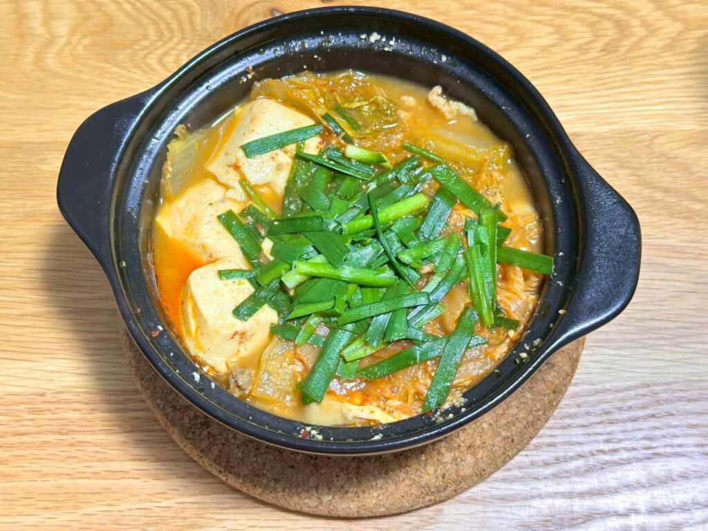 ぐつぐつの状態で食べられる一人用土鍋はとても便利で、お鍋そのものの熱さも楽しめますし、ピリ辛のキムチ味がたまらない…。