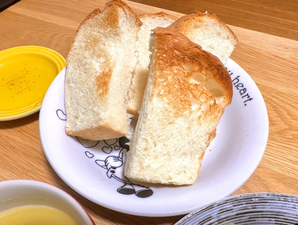 ということで、以前購入したコストコの北海道山形食パンがまだ冷凍庫に残っていたので、トースターで温めて一緒にいただきました。