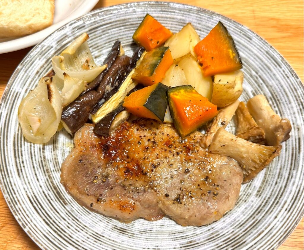 【お家ごはん】豚ロース肉とお野菜のオーブン焼きと北海道山形食パン