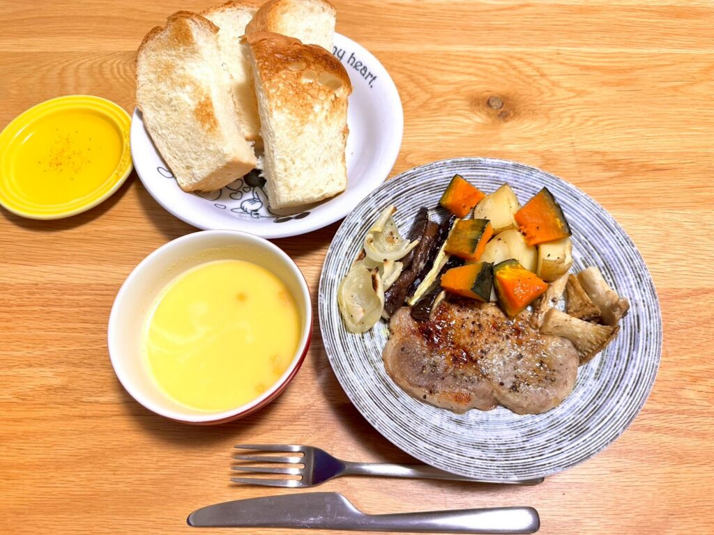 豚ロースとんかつ用の分厚いお肉をオーブン焼きにしたものをメインに、コーンスープ、以前購入したコストコの北海道山形食パンを添えています。