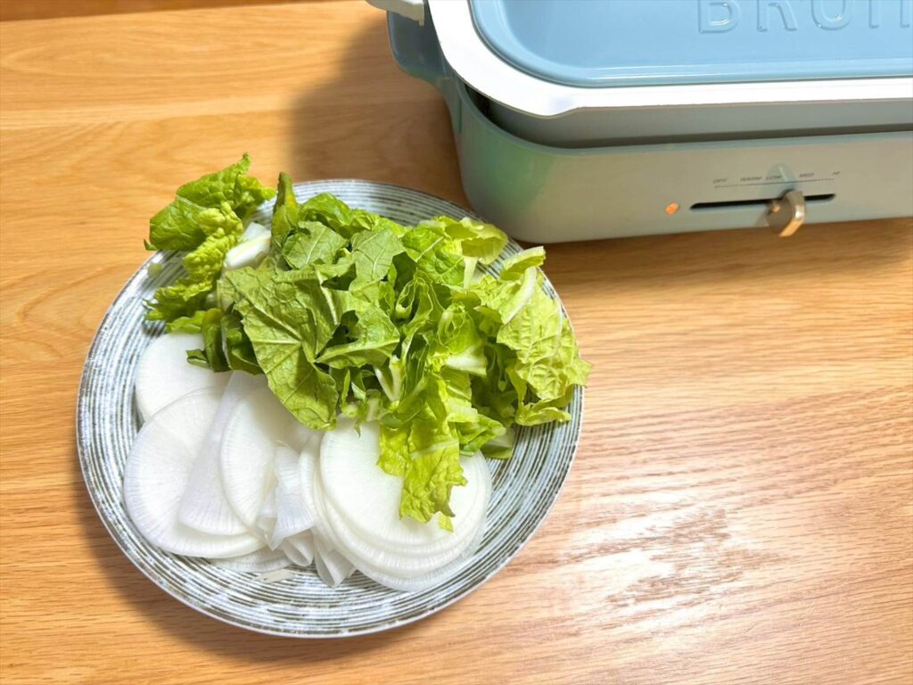 お野菜は薄くスライスした大根、白菜に、写真には不在ですが豆苗を用意しています。