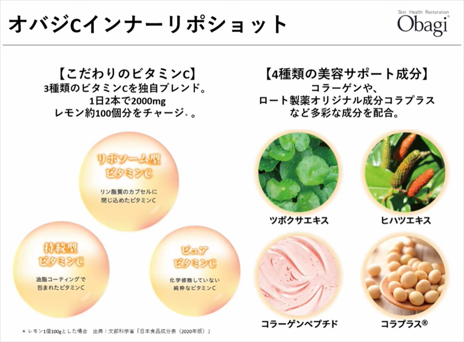 - オバジ独自のリポショットCビタミンCを1日(目安量)当たり2000mg配合