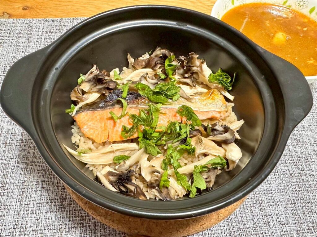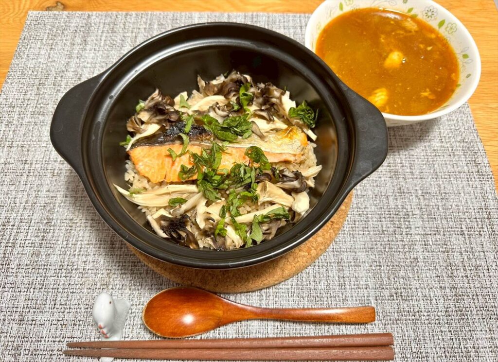 【お家ごはん】余りカレーのスープと秋鮭ときのこの炊き込み土鍋ごはん