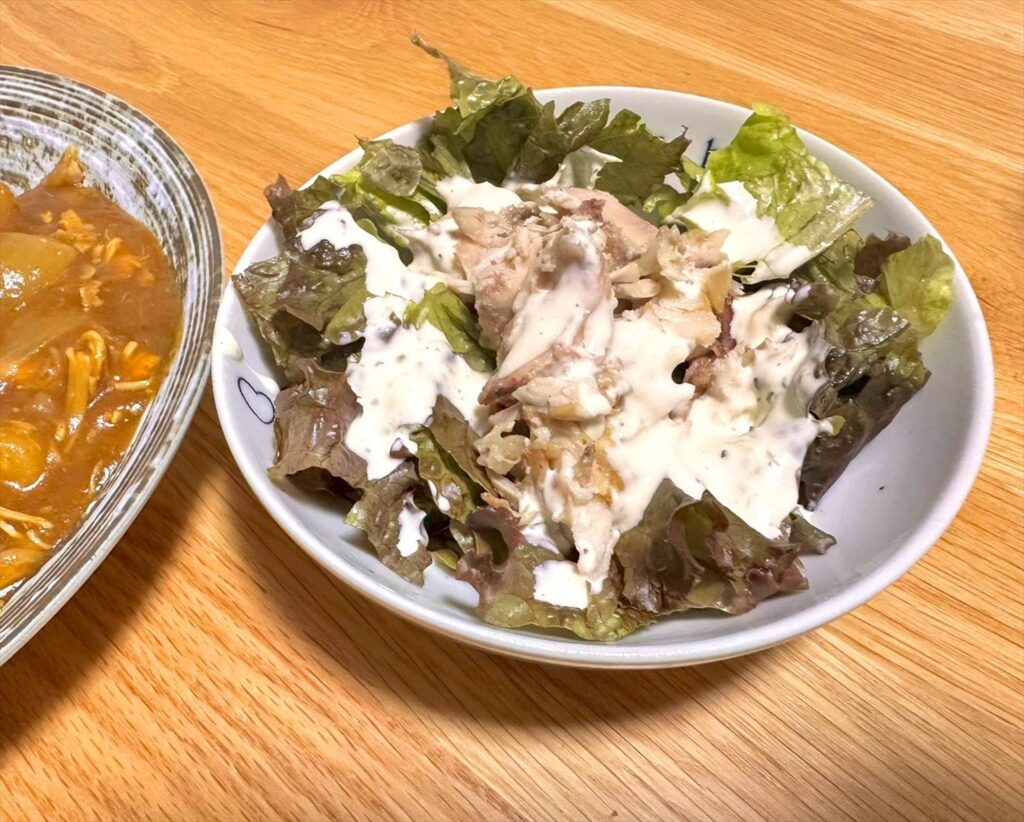 ▲サラダはサニーレタスに、こちらも昨日余ったロティサリーチキンを載せて、シーザードレッシングをかけたもの。