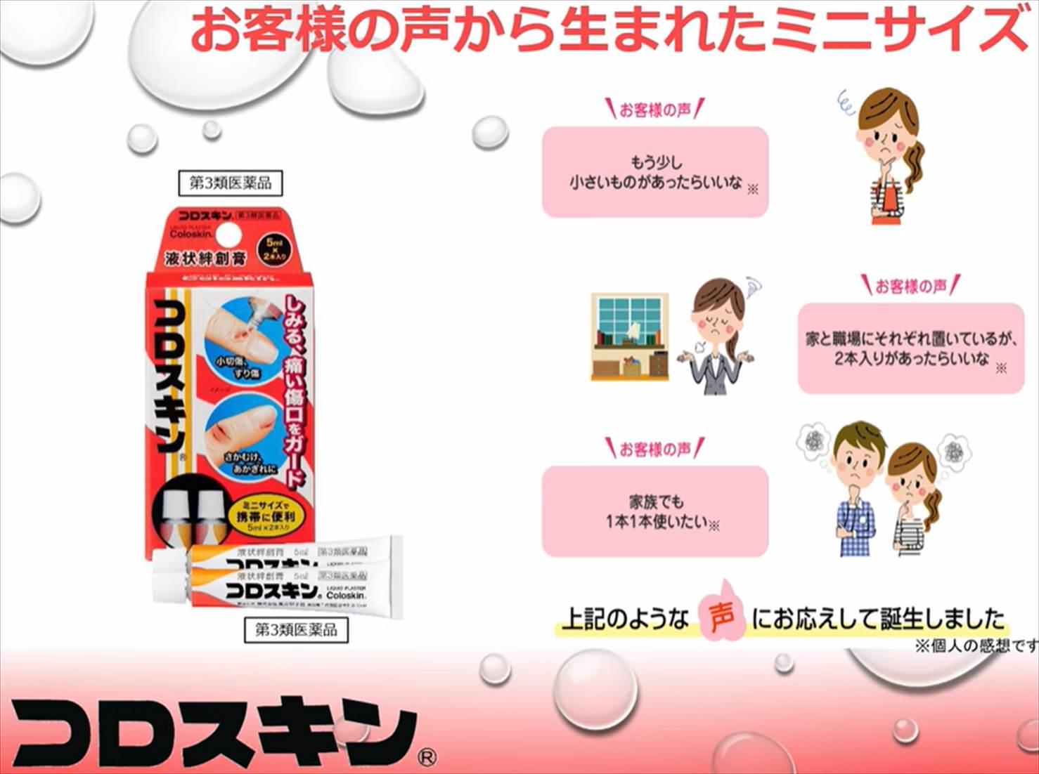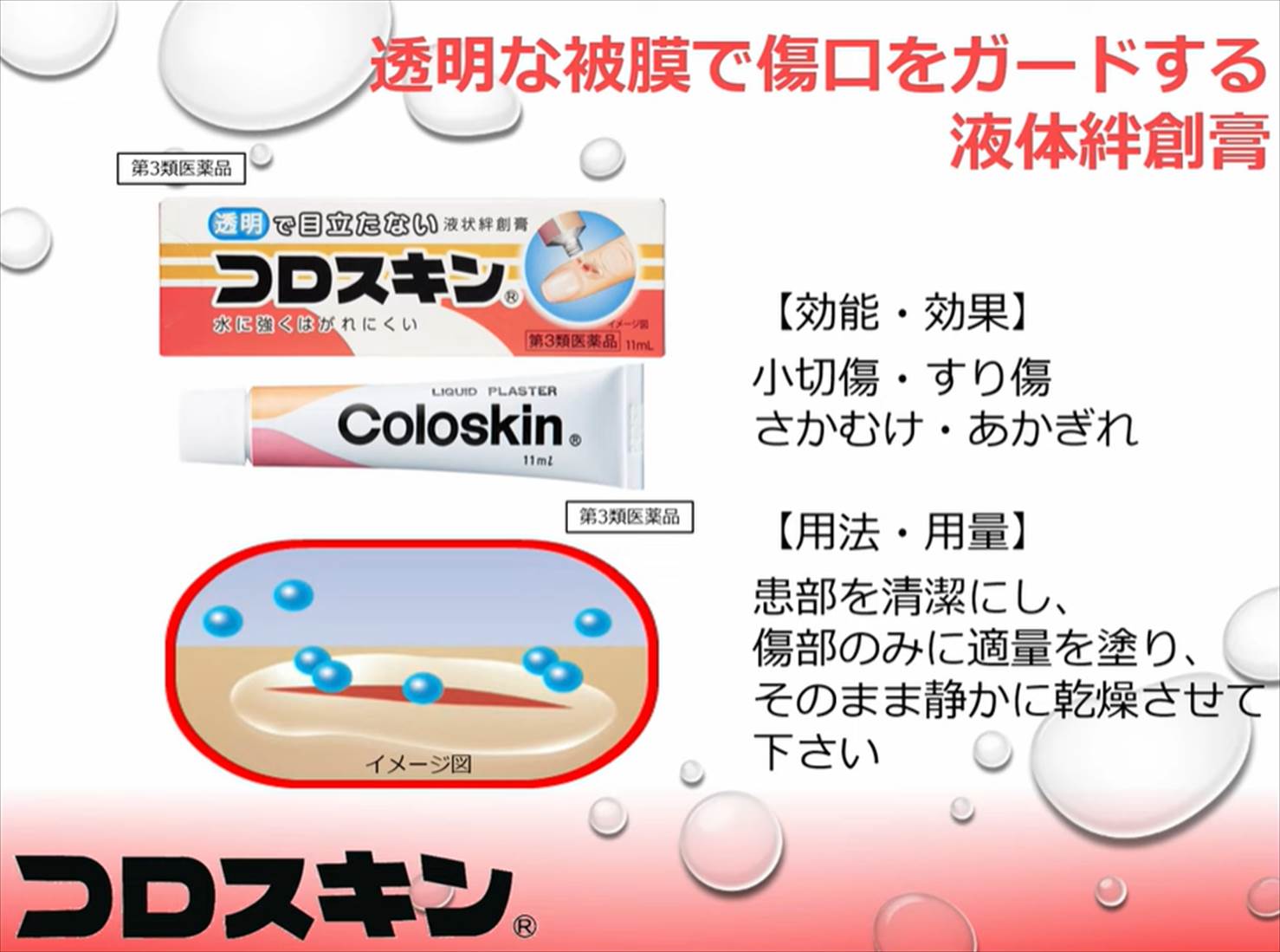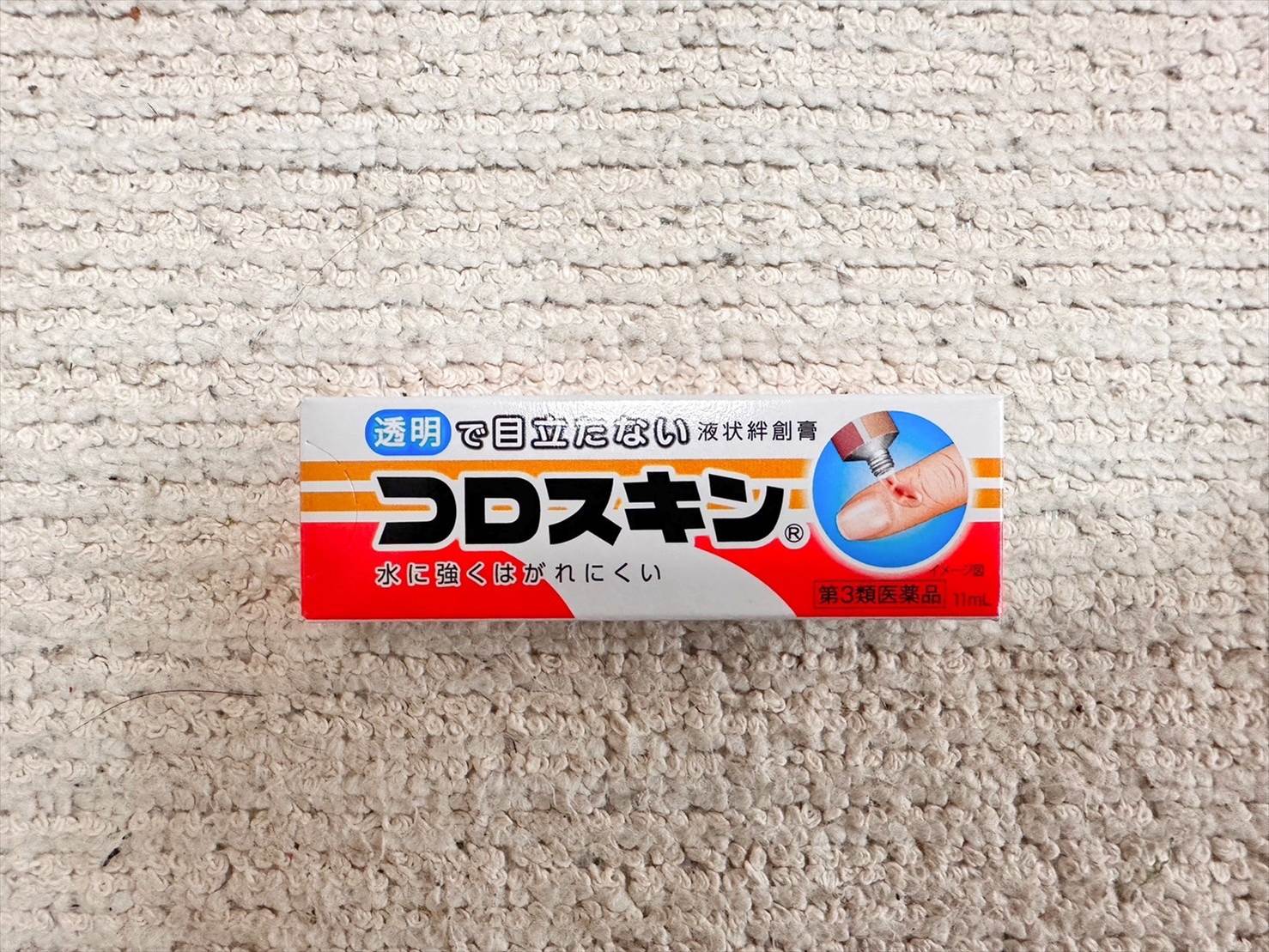 「コロスキン」は、液体タイプの絆創膏。切り傷やすり傷に塗ることで、患部を保護しつつ水や雑菌から守ってくれる便利なアイテムです。