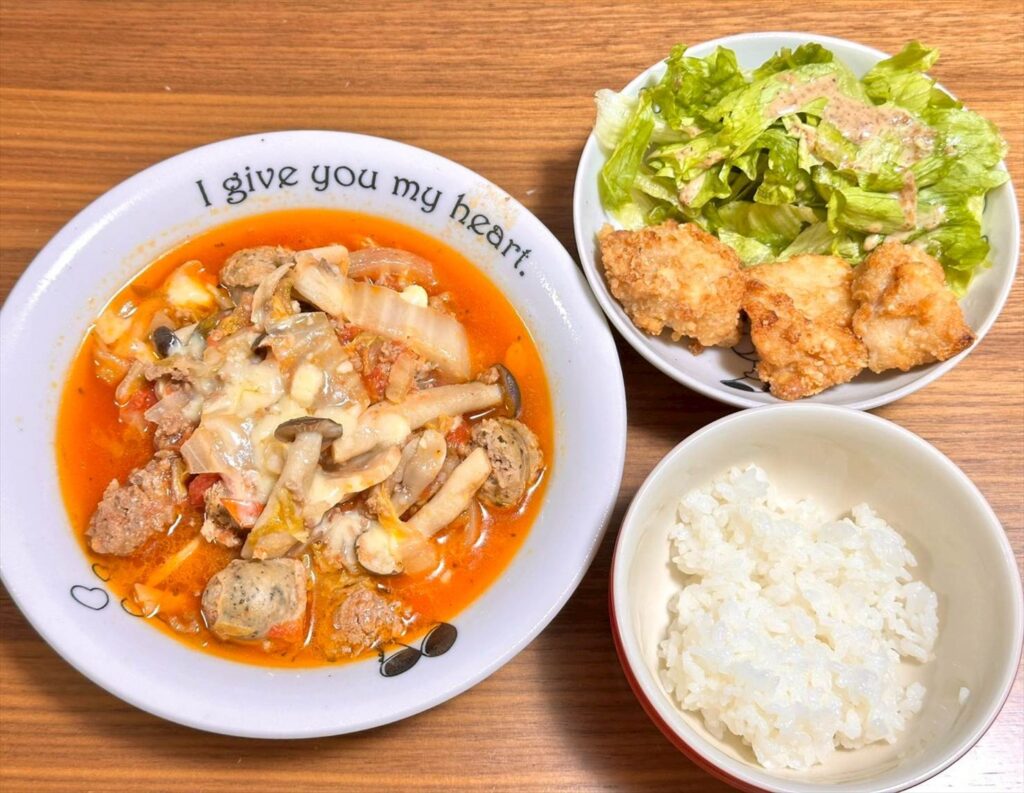 白菜とひき肉のトマト煮込み、ローソンの冷凍鶏むね唐揚げ添えのサラダ、白ご飯です。