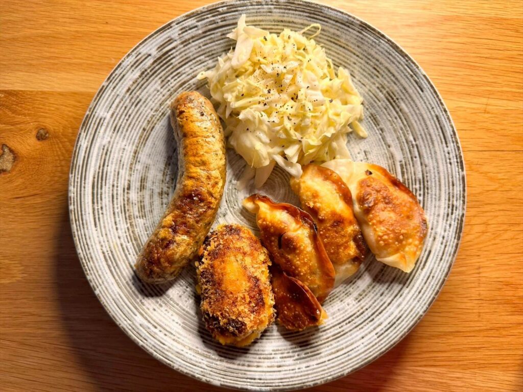 左から、業務スーパーのこだわり生フランク、かぼちゃコロッケ、かぼちゃの揚餃子、コールスロー風キャベツです。