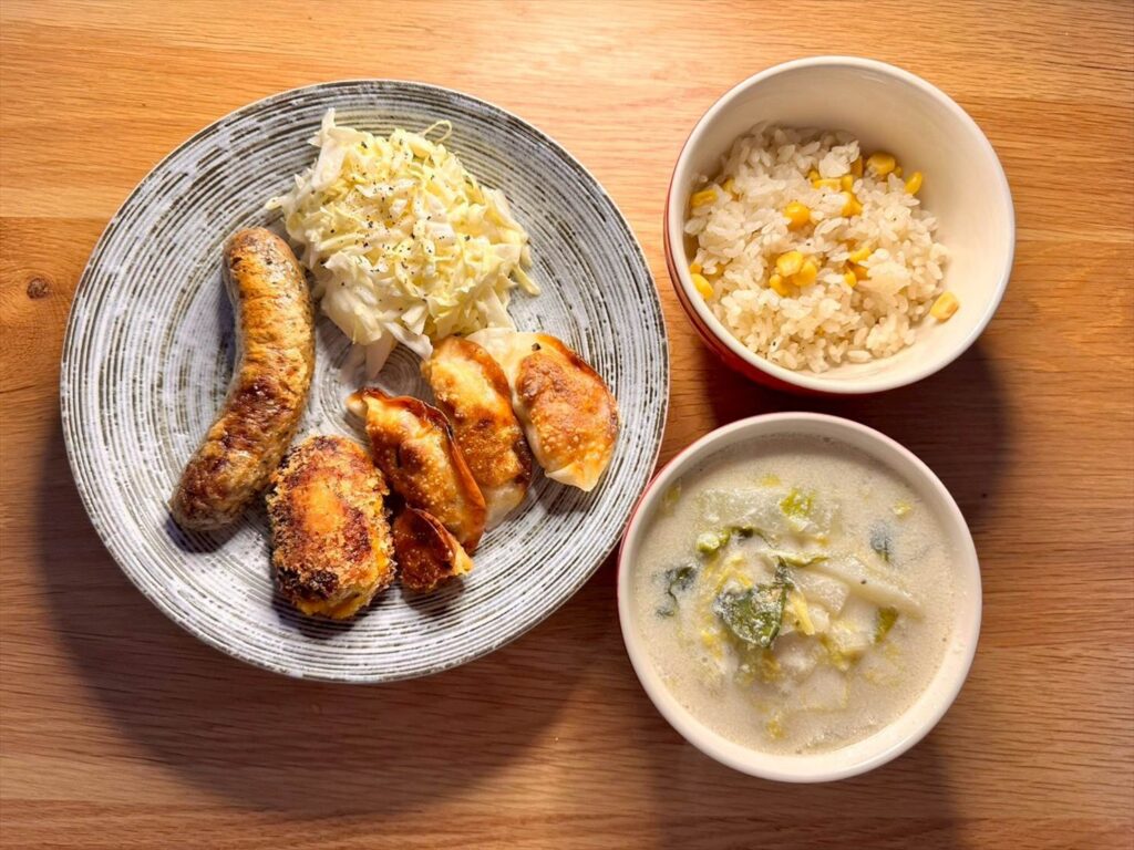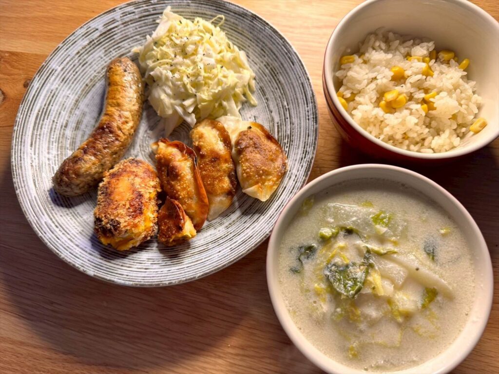 色々おかずの盛り合わせ、白菜のミルクスープ、コーンご飯です。