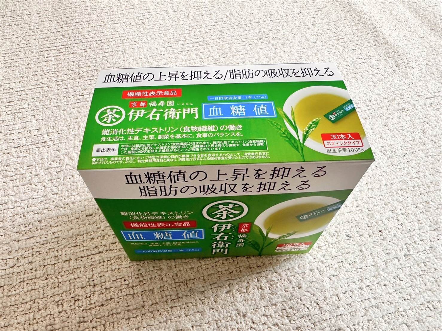 今回の記事ではサンプルボックス内の商品の一つ、「伊右衛門 機能性表示食品インスタント緑茶スティック血糖値」をご紹介。