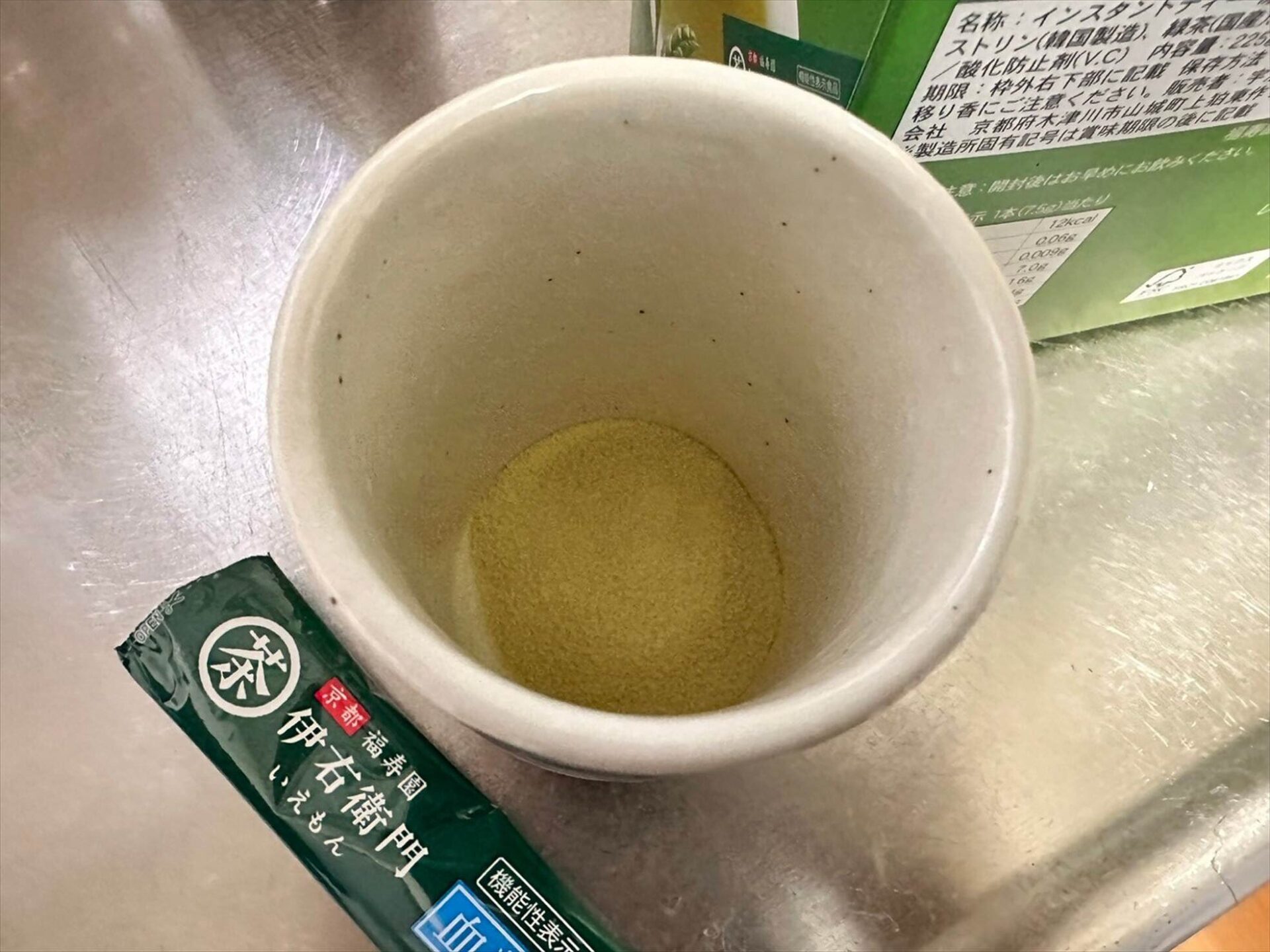 湯呑みにスティックの内容を出してみたところ、緑色の粉末が入っていました。粉末の量は結構多めですね。