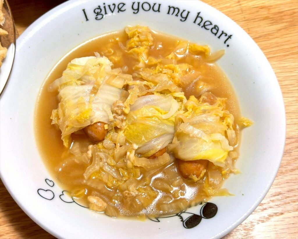 ▲スープは、ソーセージととろけるチーズを白菜で巻き、水と料理酒で煮込んだところに醤油で味付けしたもの。