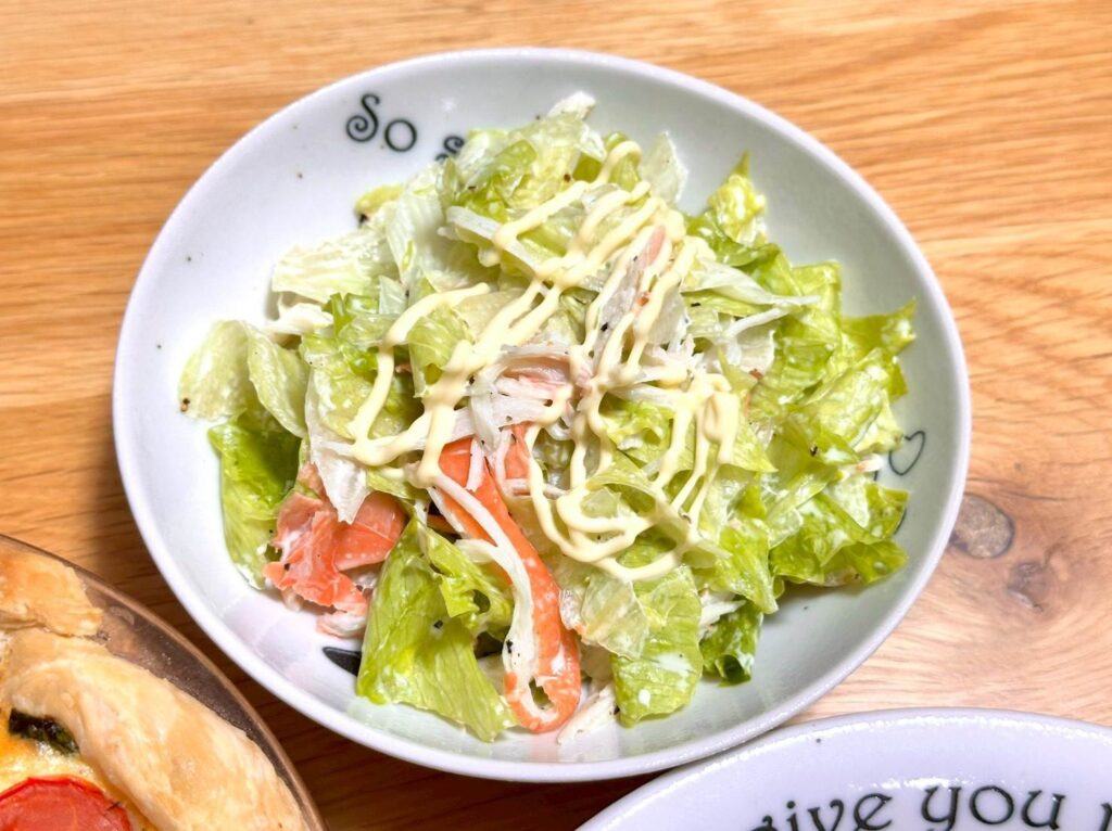 ▲サラダはカニカマとレタス、鶏ガラスープのもとにマヨネーズを入れて和えたもの。