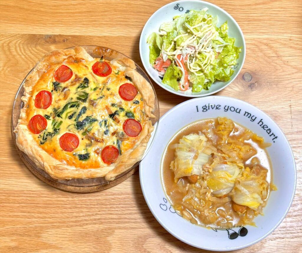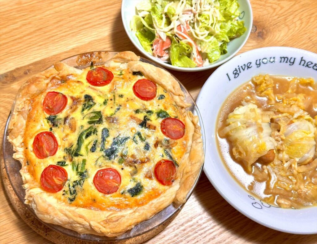 【お家ごはん】ほうれん草とベーコンのキッシュ、白菜とソーセージのスープとカニカマサラダ