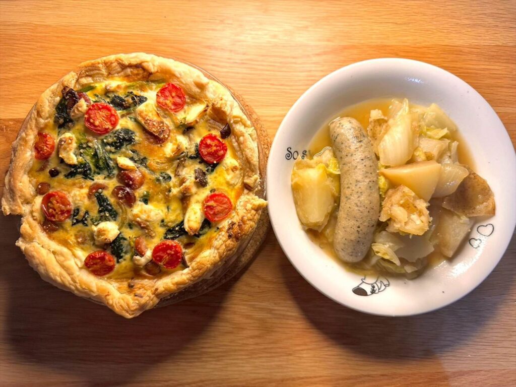 ほうれん草とソーセージを用いたキッシュと、業務スーパー生フランクを使ったポトフです。