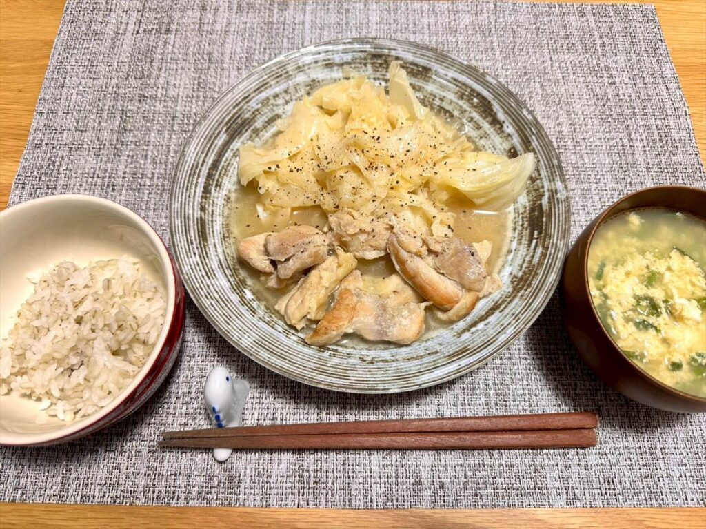 メインのキャベツと鶏肉の塩煮込みに、ニラ玉のスープ、もち麦ごはん。