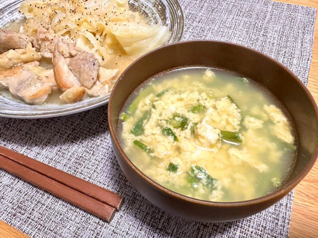 ▲ニラ玉スープは、鶏ガラスープの素に塩・ごま油をちょこっと入れて、そこに卵とニラ(それも冷凍のやつ)をパラパラっと入れて煮ただけの簡単メニュー。