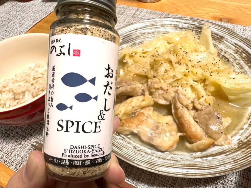 ▲さらにそんなキャベツと鶏の塩煮込みには、先日結婚式のお引き出物としていただいた「おだし&スパイス」をプラス!