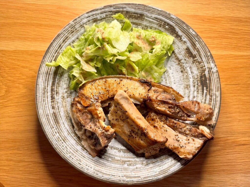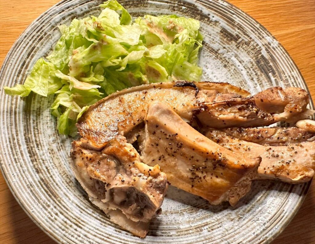 塩水に漬けて解凍したまぐろのカマに、適量の塩胡椒を振ってフライパンで焼いたもの。