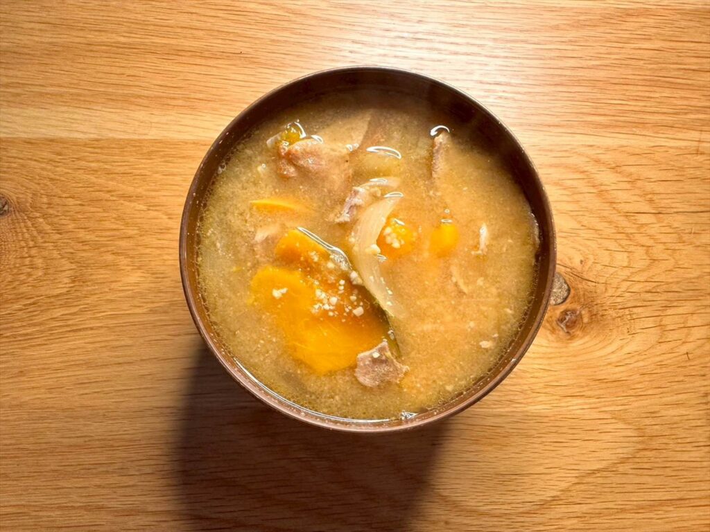 冷蔵庫に余っていたかぼちゃを入れて、冬らしい味わいにしてみました。