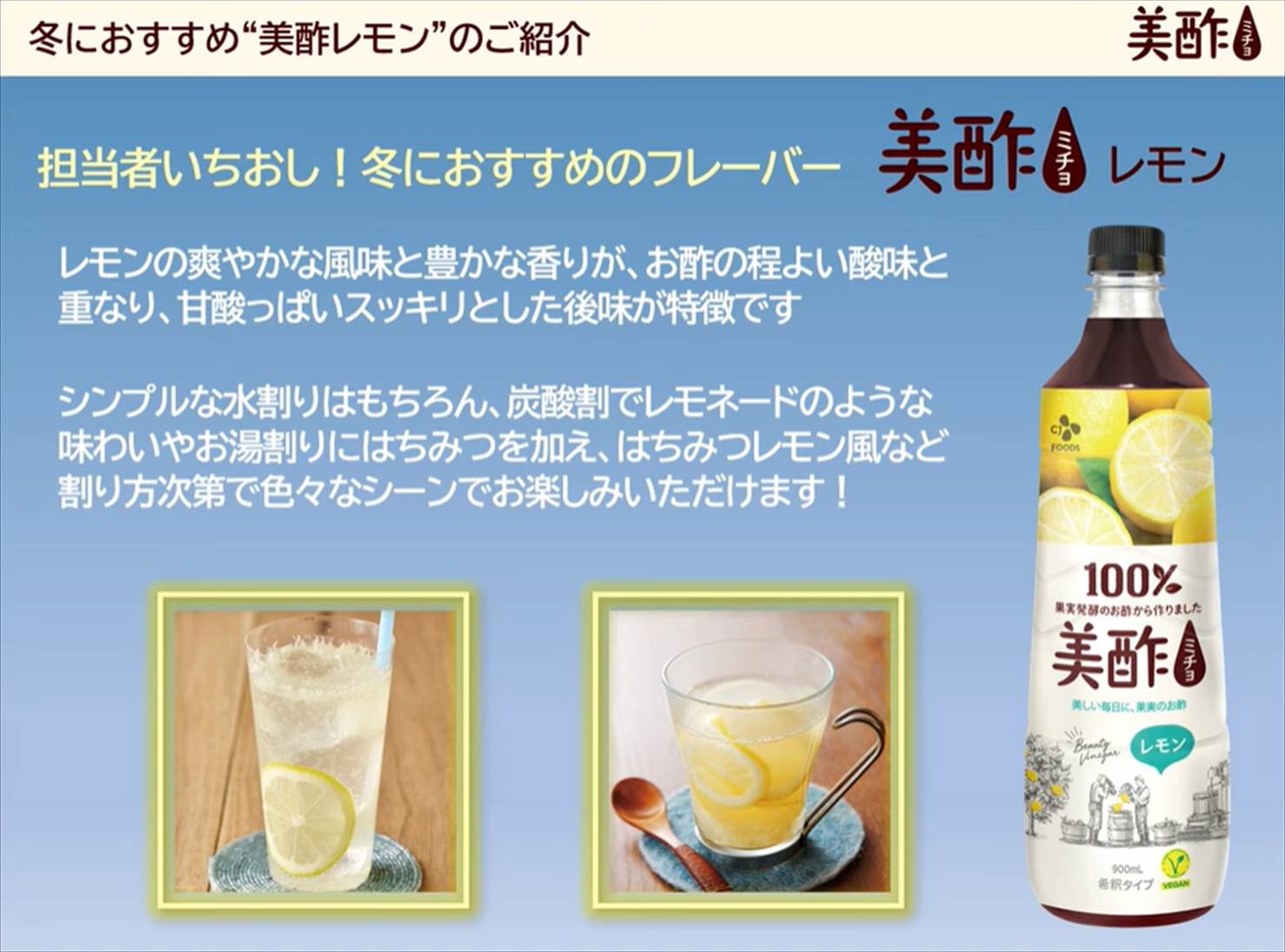 「美酢」はCJフーズジャパンが提供する、100%果実発酵酢を使った飲むお酢シリーズ。