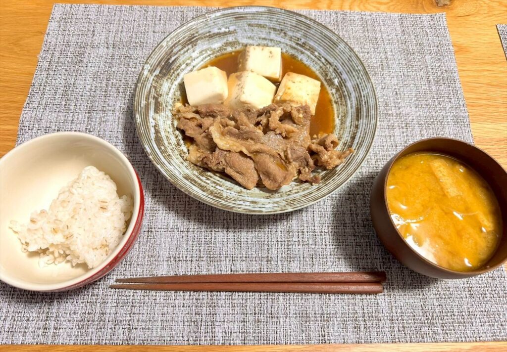 【お家ごはん】豚こまで作る!味染み肉豆腐とかぼちゃの味噌汁