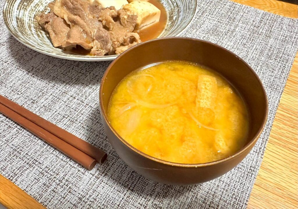 ▲お味噌汁。本日の具は、玉ねぎ・油揚げ・かぼちゃ!