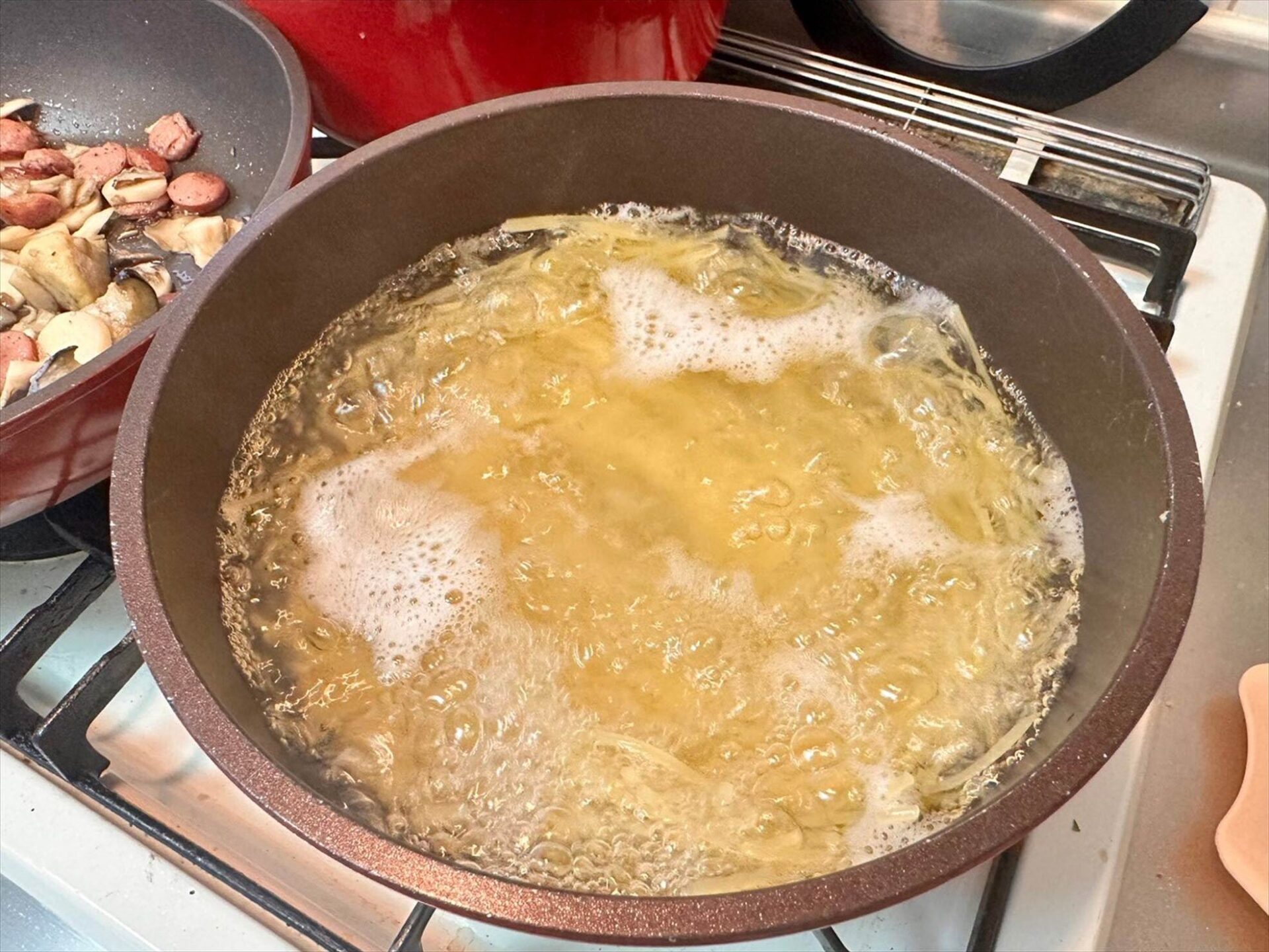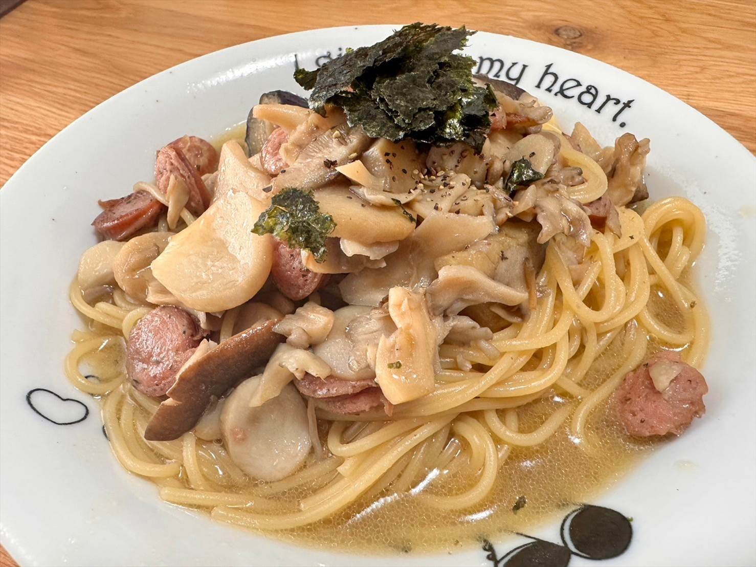 今回は冷蔵庫に大量にきのこが合ったので、きのことソーセージの和風パスタにしてみました。