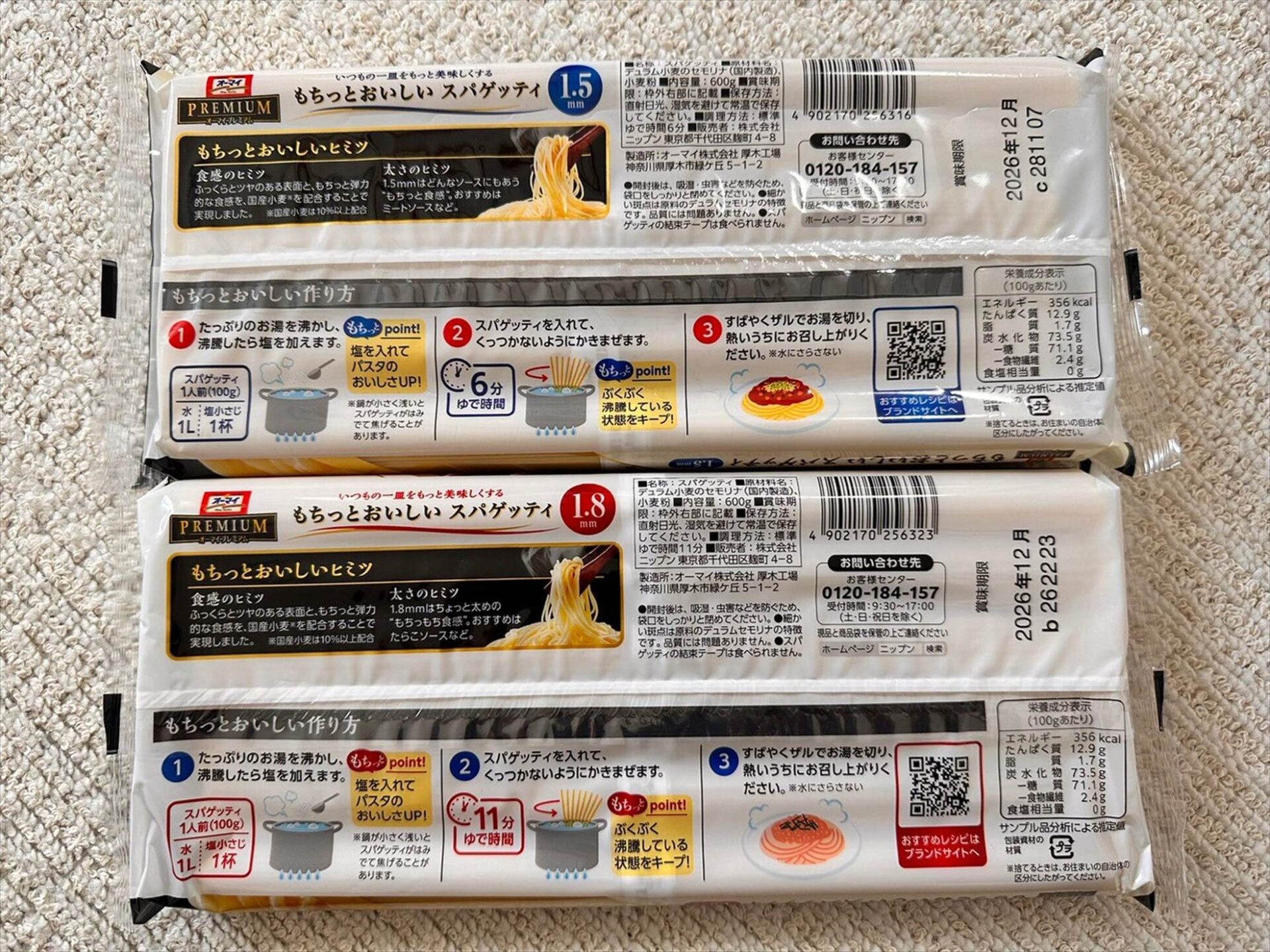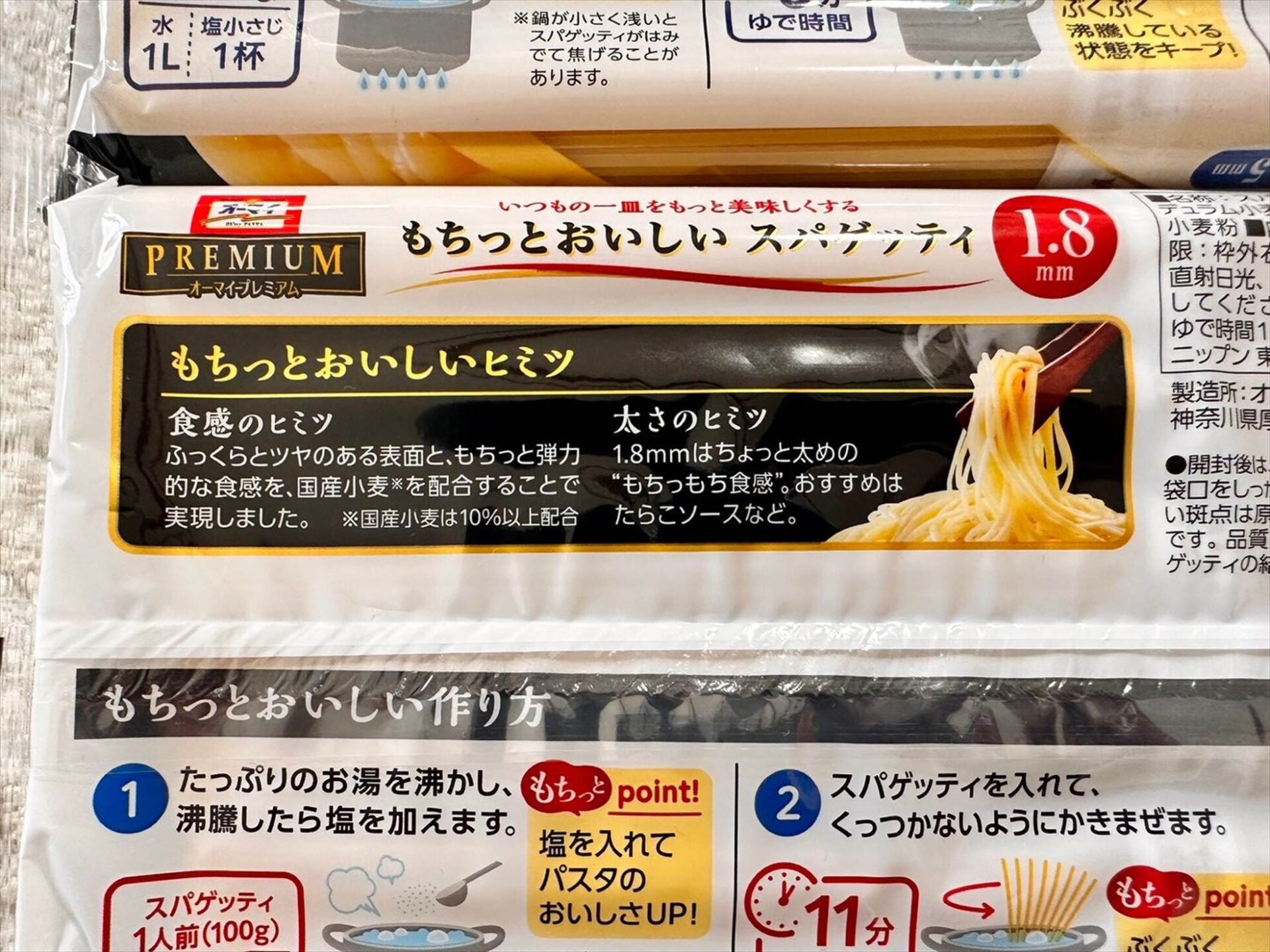 | 公式HP | オーマイプレミアム もちっとおいしいスパゲッティ 1.5mm|商品情報|株式会社ニップン (nippn.co.jp) | ||