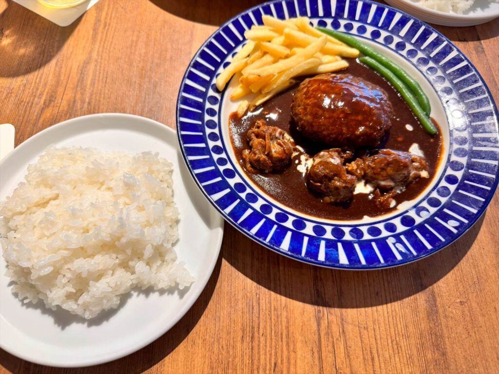 いかにもカフェランチ!というようなおしゃれな一皿で、とろとろの牛タンにとハンバーグが一緒に楽しめる、一度で二度美味しいメニュー。
