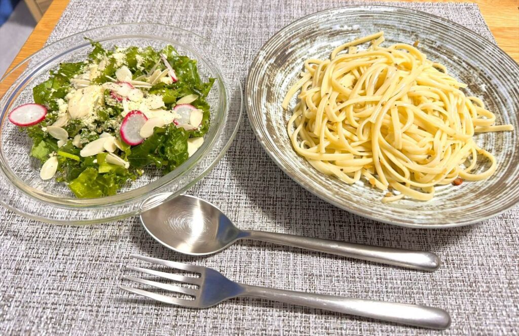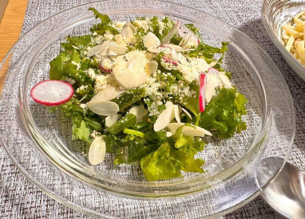 流石にパスタだけだと寂しいのと、栄養バランスが欲しくなったので、Oisixのお試しセットで届いた「たっぷりケールとチーズナッツのサラダ」も添えています。
