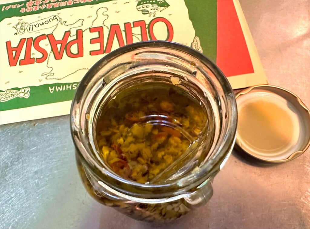 粗みじん切りになったにんにくがこれでもか!というほど入り、更に輪切りの唐辛子もたっぷり。