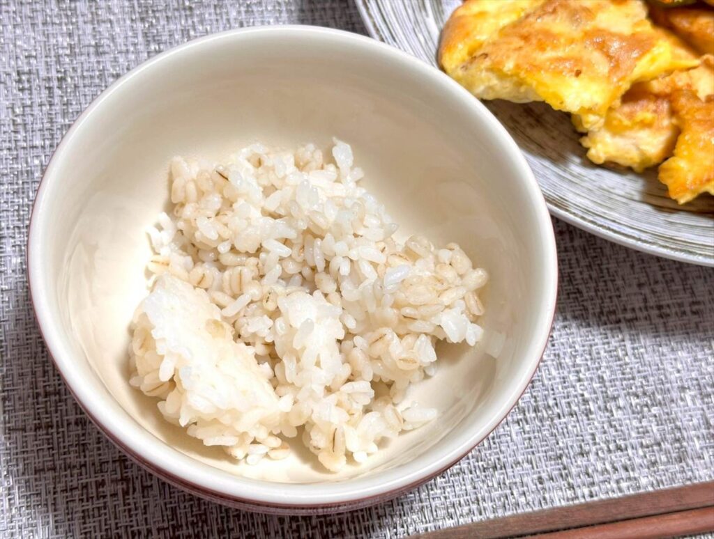 ▲ご飯はもち麦ごはん。食物繊維回収です。