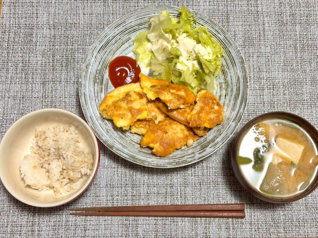 ささみのピカタをメインに、シーザーサラダ、味噌汁にもち麦ごはんです。