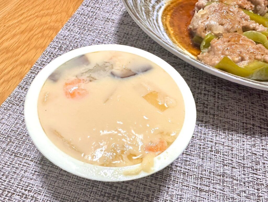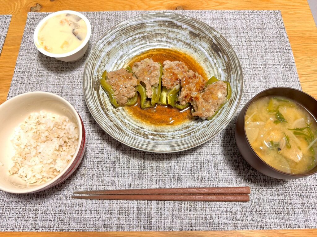 メインはピーマンの肉詰めに、豚汁、もち麦ごはんと市販の茶碗蒸しを温めて並べています。