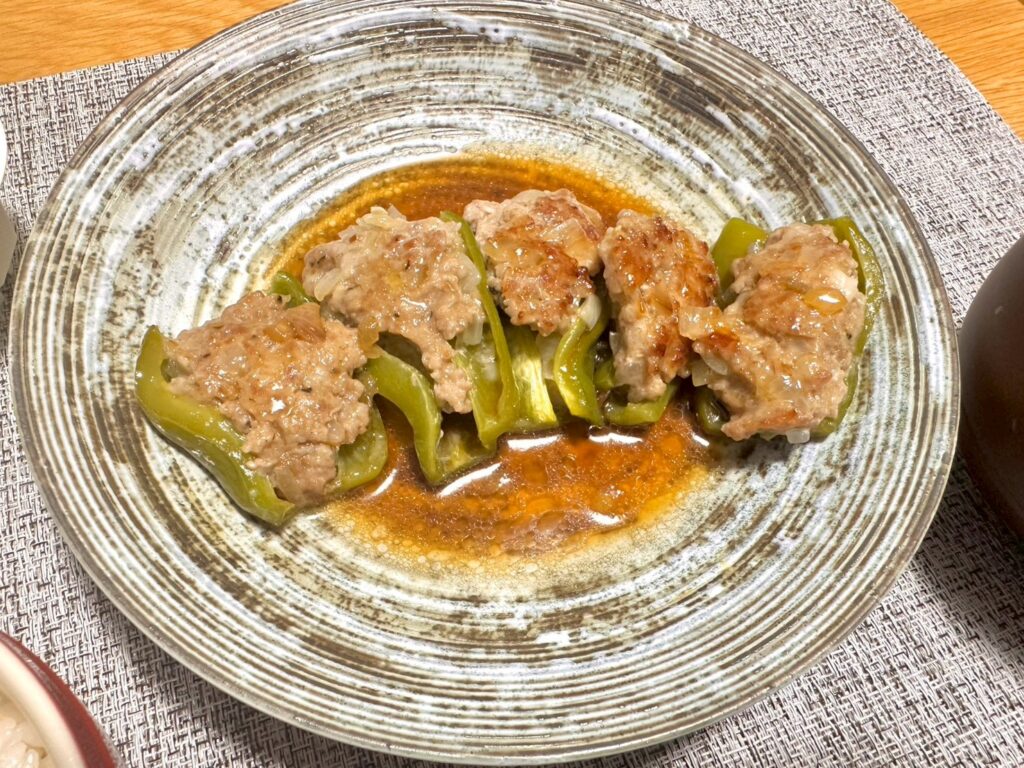 片栗粉を振ったピーマンに詰め込んで焼き、お酒・醤油・みりんで味付けしました。