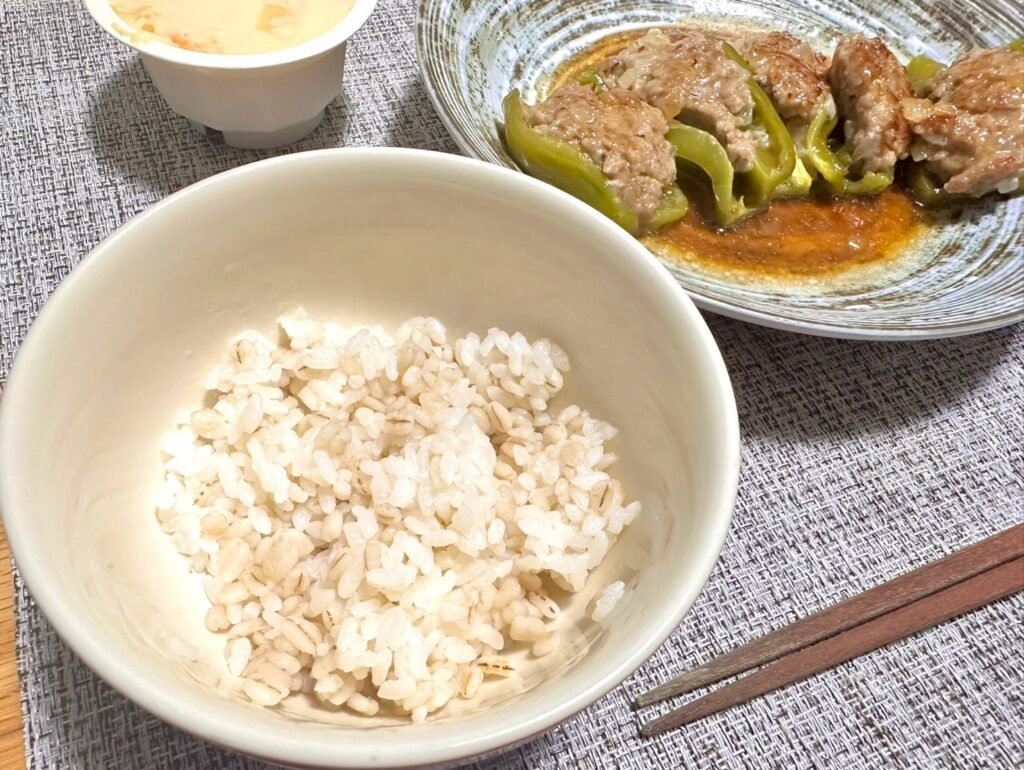 ▲もち麦ごはん。ピーマンの肉詰めに使っているタレとの相性抜群です。