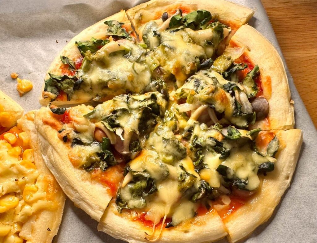 玉ねぎ、ソーセージ、しめじ、ほうれん草をたっぷり乗せて、その上にチーズとバジルソースをかけて焼き上げました。