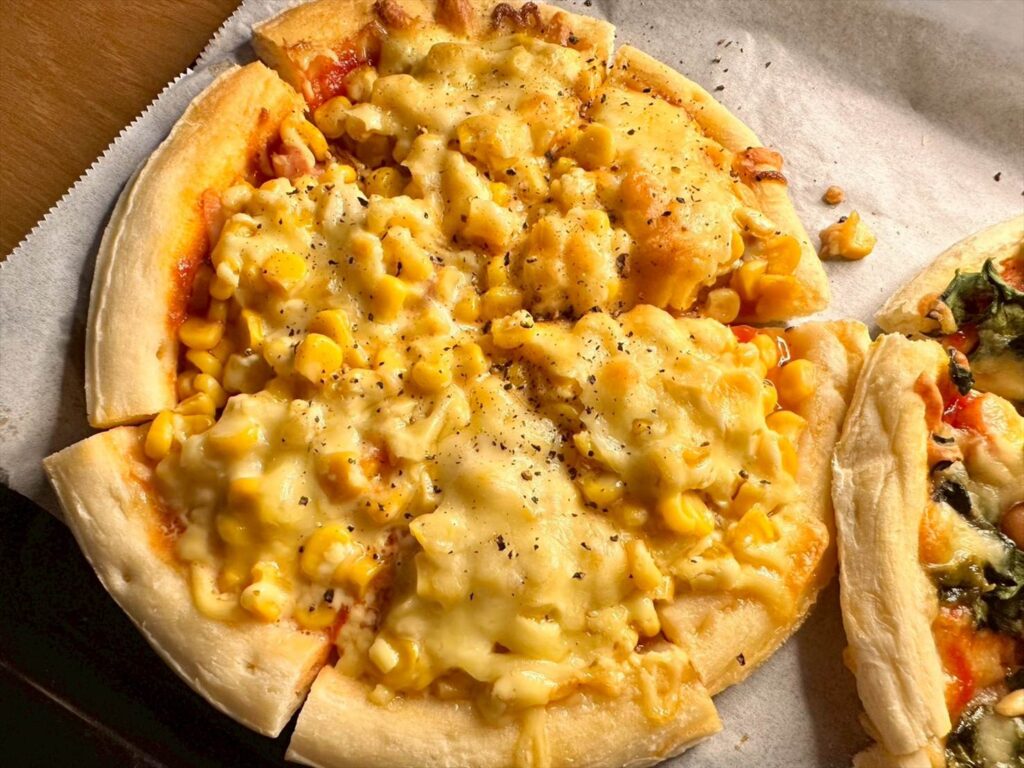 ガストのメニューをイメージして、トマトソースにたっぷりのコーン、マヨネーズにチーズを乗せて焼き上げました。