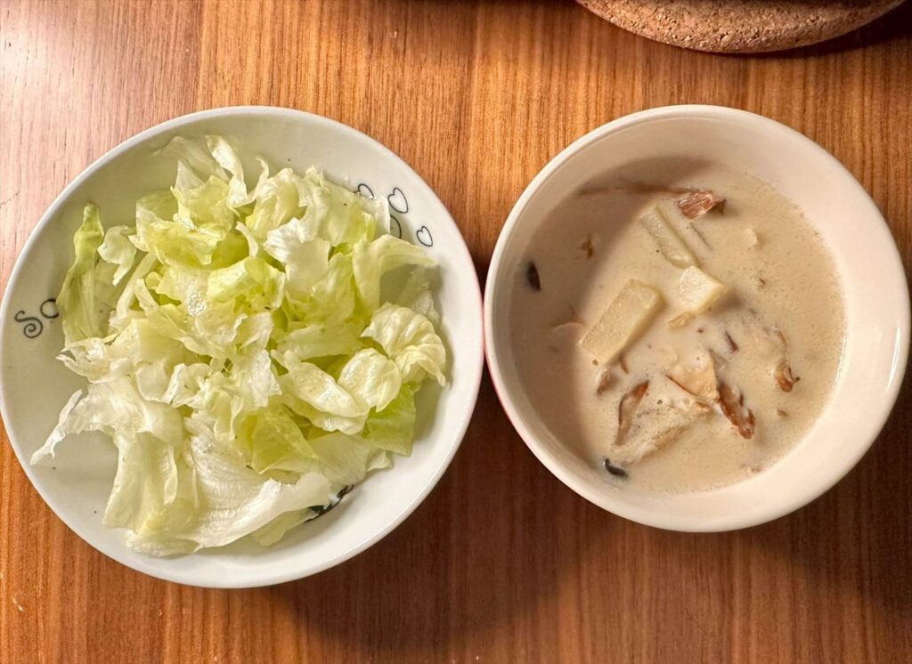 ▲そんなピザには、レタスをちぎってドレッシングをかけただけのシンプルなサラダに、きのこのクリームスープを添えています。