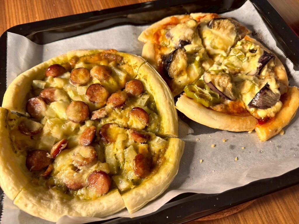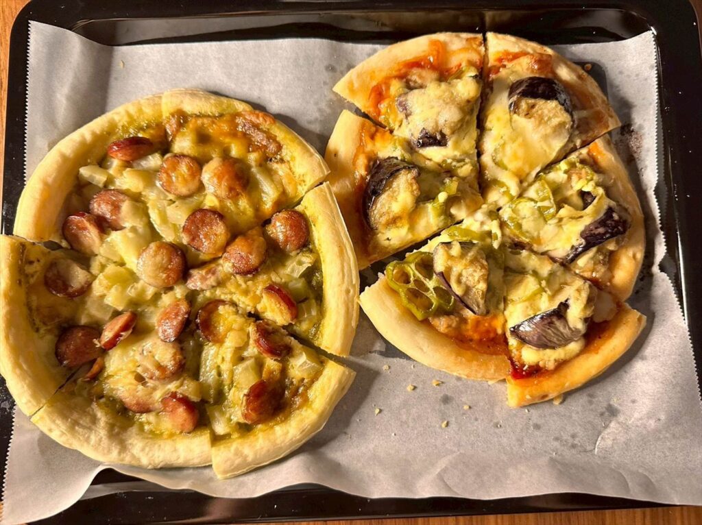 右がトマトソースベースのツナとピーマン、なすのピザ。左がジェノベーゼソースベースの、ソーセージとじゃがいものピザです。
