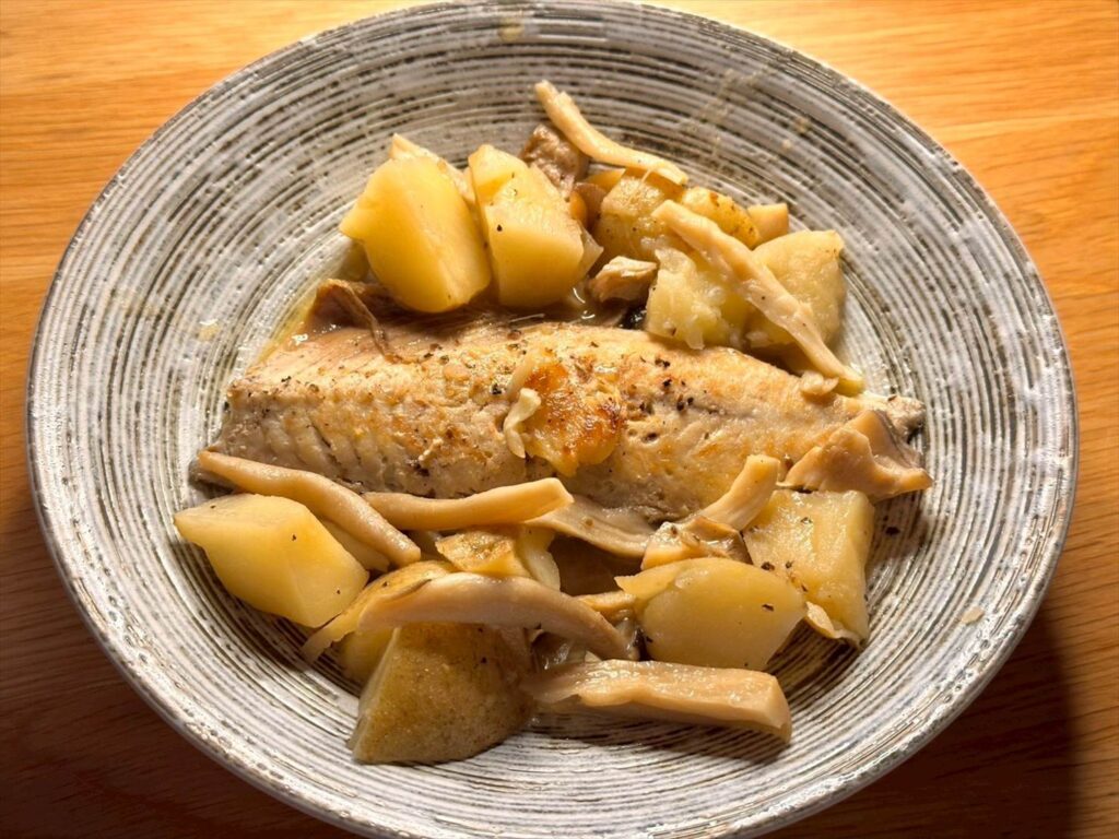 さばを焼いて、そこにじゃがいも・しめじ・エリンギを入れ、料理酒と水・オリーブオイルで煮込んで仕上げました。