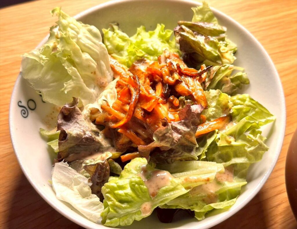 これが結構良かったようで、カリカリ食感で香ばしいニンジンと、さっぱりとしたレタスがうまく合う、美味しいサラダになりました~!
