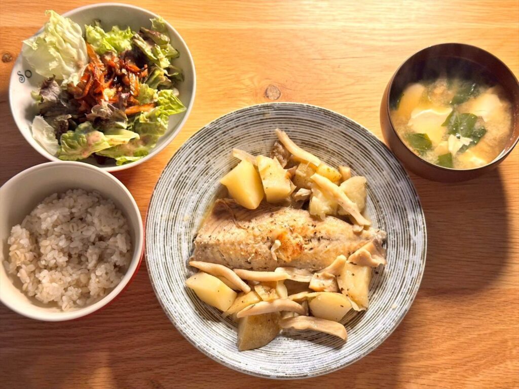 さばのアクアパッツァをメインに、お味噌汁、ニンジンとレタスのサラダ、もち麦ごはんです。