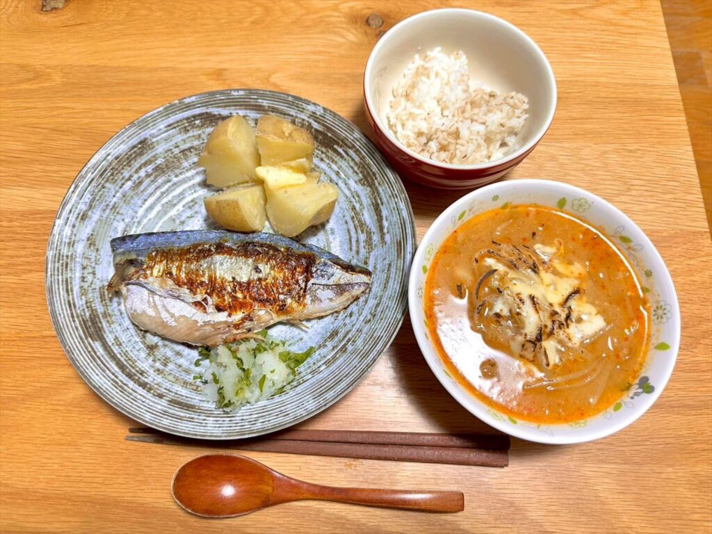 【お家ごはん】ふるさと納税返礼品のさばを使って!さば塩焼きともやしのピリ辛味噌スープ