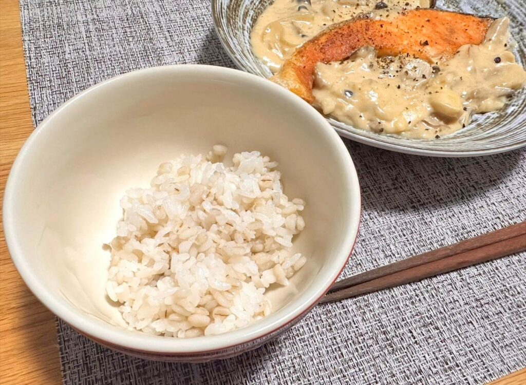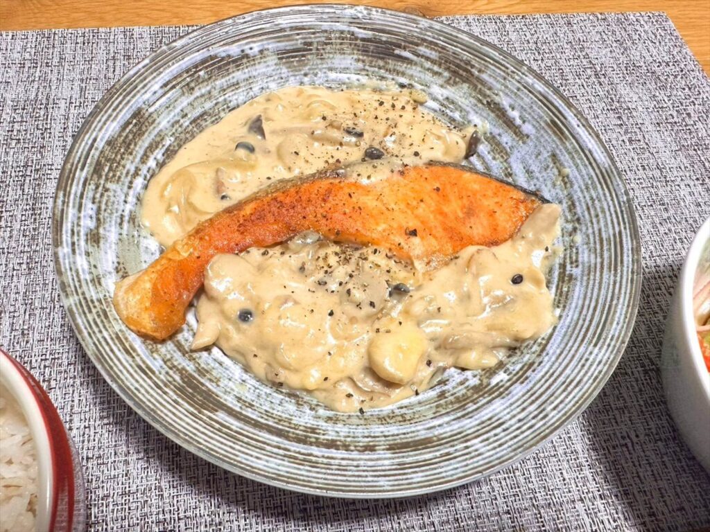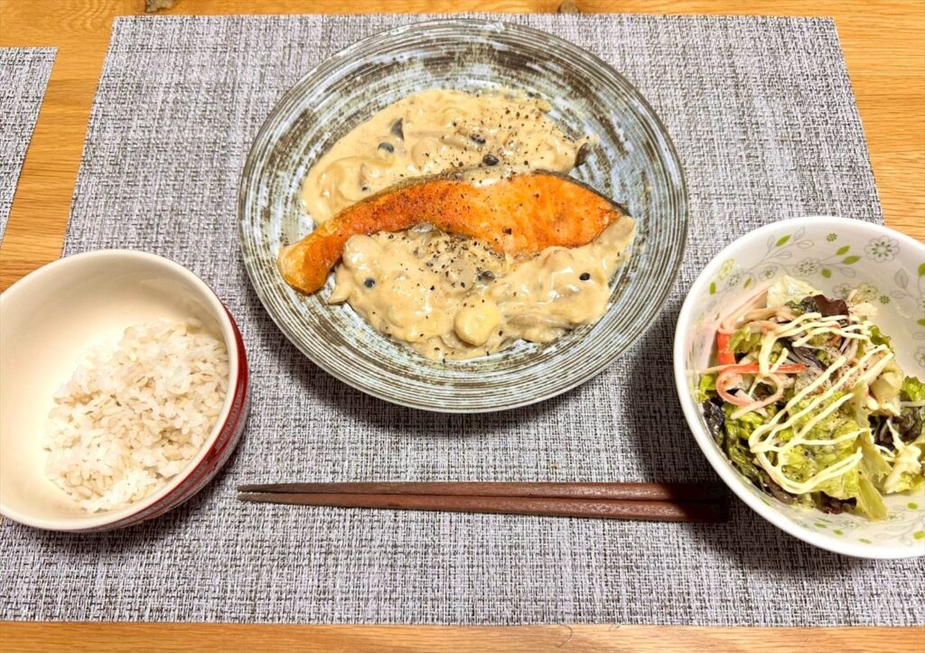 鮭ときのこのクリーム煮をメインに、もち麦ごはんと、先日天津飯を作ったときに余ったカニカマとレタスを和えたサラダを添えてみました。