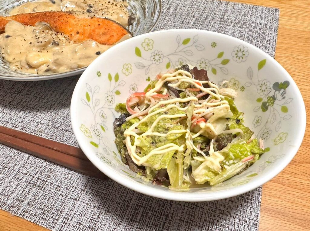 ▲サラダは、冷蔵庫に余っていたカニカマとサニーレタスを混ぜて、マヨポン酢と塩胡椒で味付けしています。