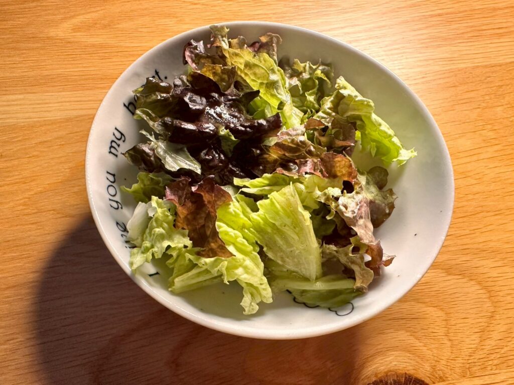 ▲サラダはシンプルに、グリーンリーフをちぎってドレッシングをかけたもの。メインが重めなのでサイドはシンプルで良いんです。